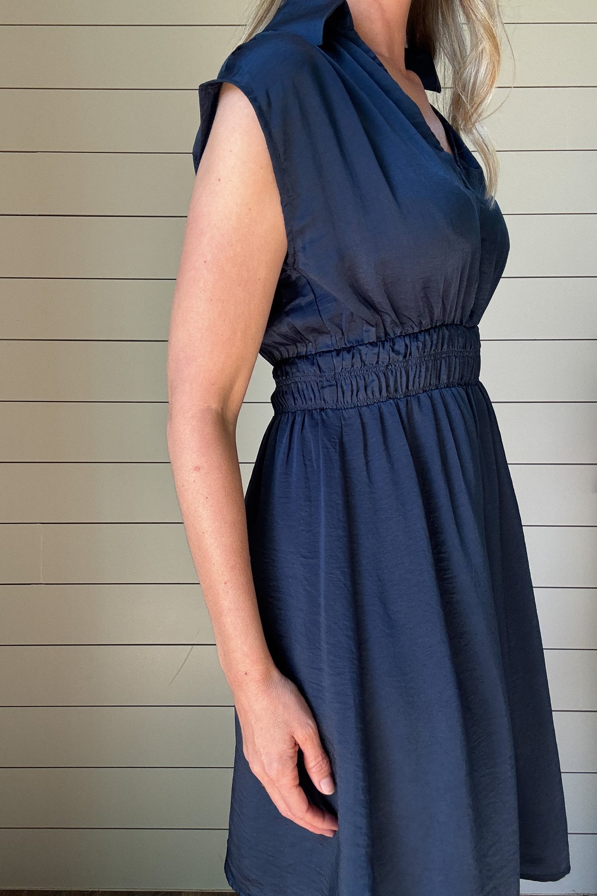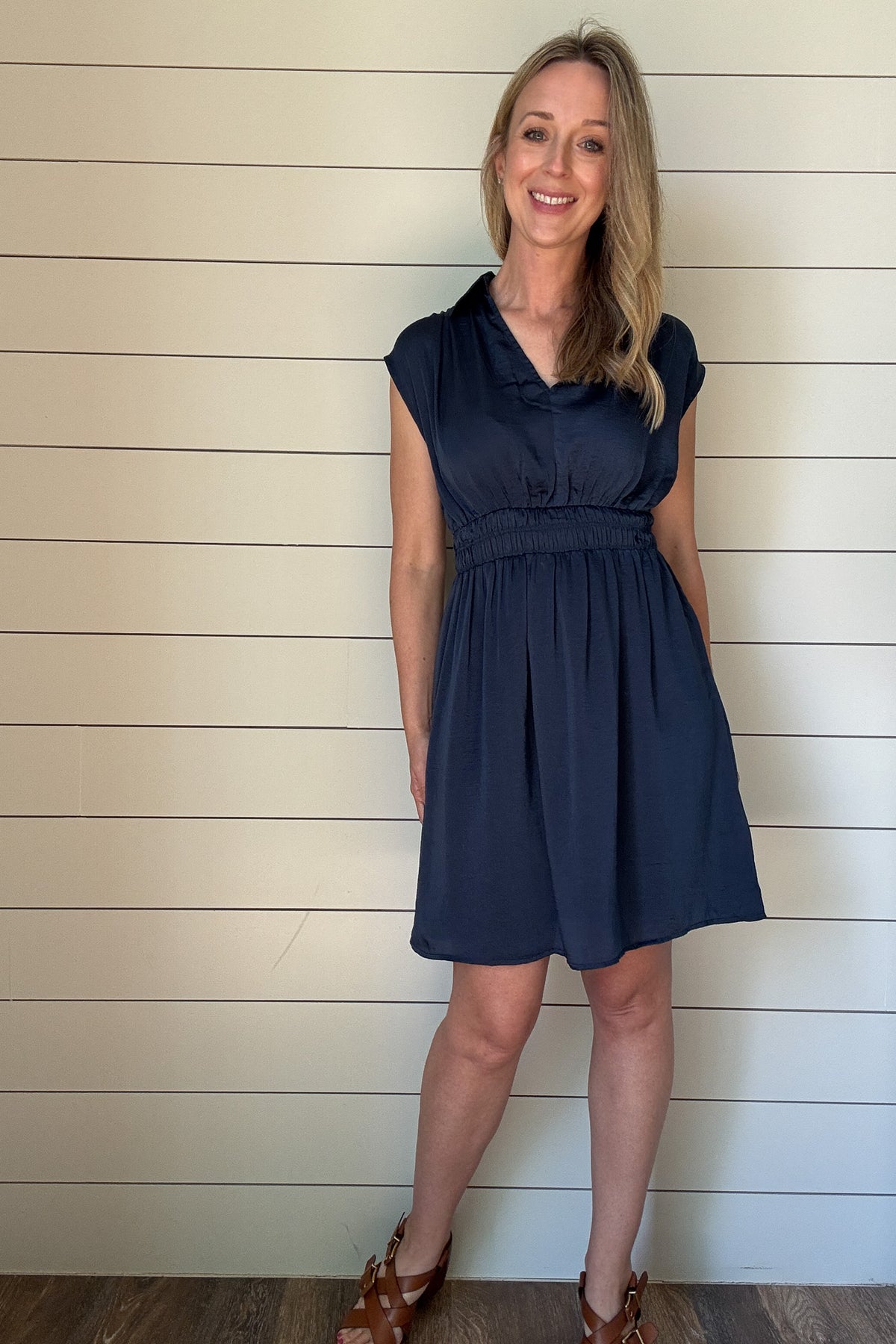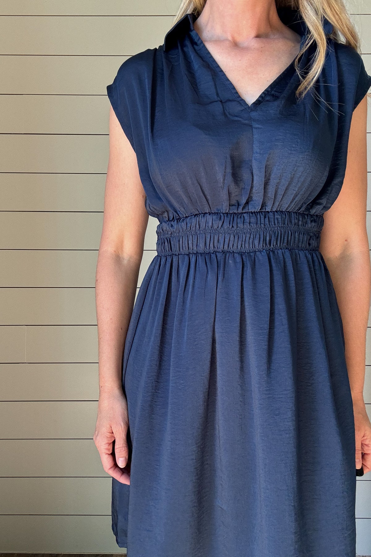 This navy knee-length dress is the definition of easy elegance. Made from a soft, satiny fabric with a subtle sheen, it drapes beautifully and feels light on the skin. The bodice is unlined for breathability, while the skirt is lined for comfort and coverage. A flattering V-neckline with a small collar adds polish without being fussy.