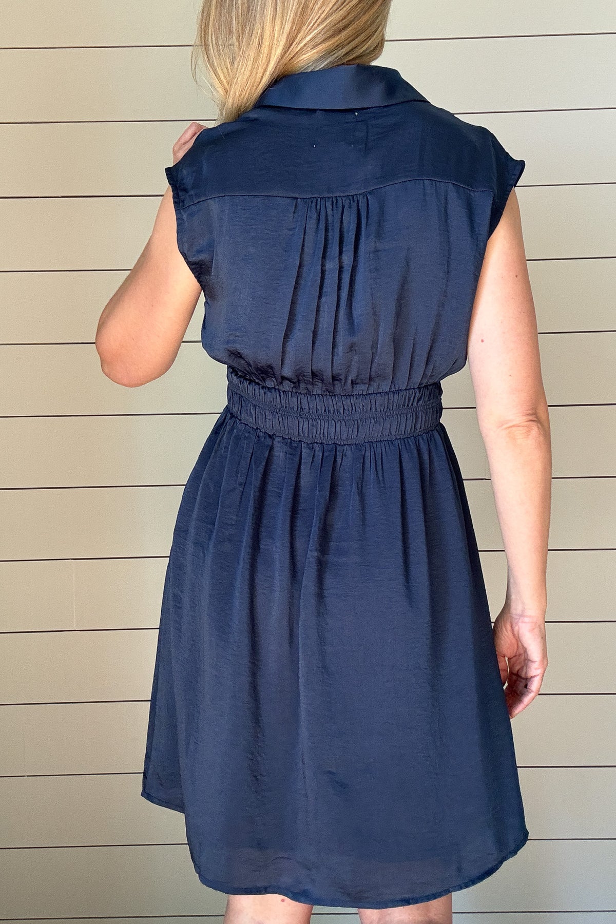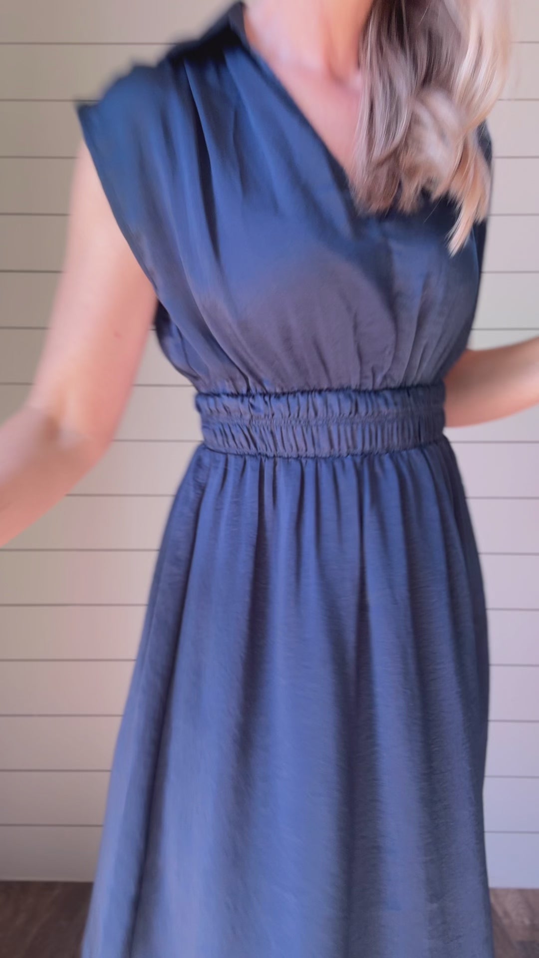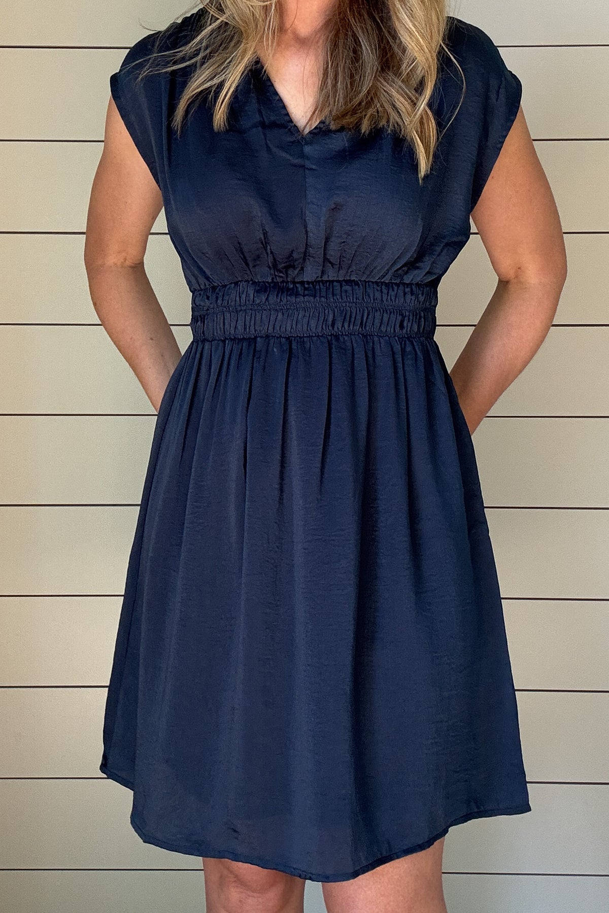 This navy knee-length dress is the definition of easy elegance. Made from a soft, satiny fabric with a subtle sheen, it drapes beautifully and feels light on the skin. The bodice is unlined for breathability, while the skirt is lined for comfort and coverage. A flattering V-neckline with a small collar adds polish without being fussy.