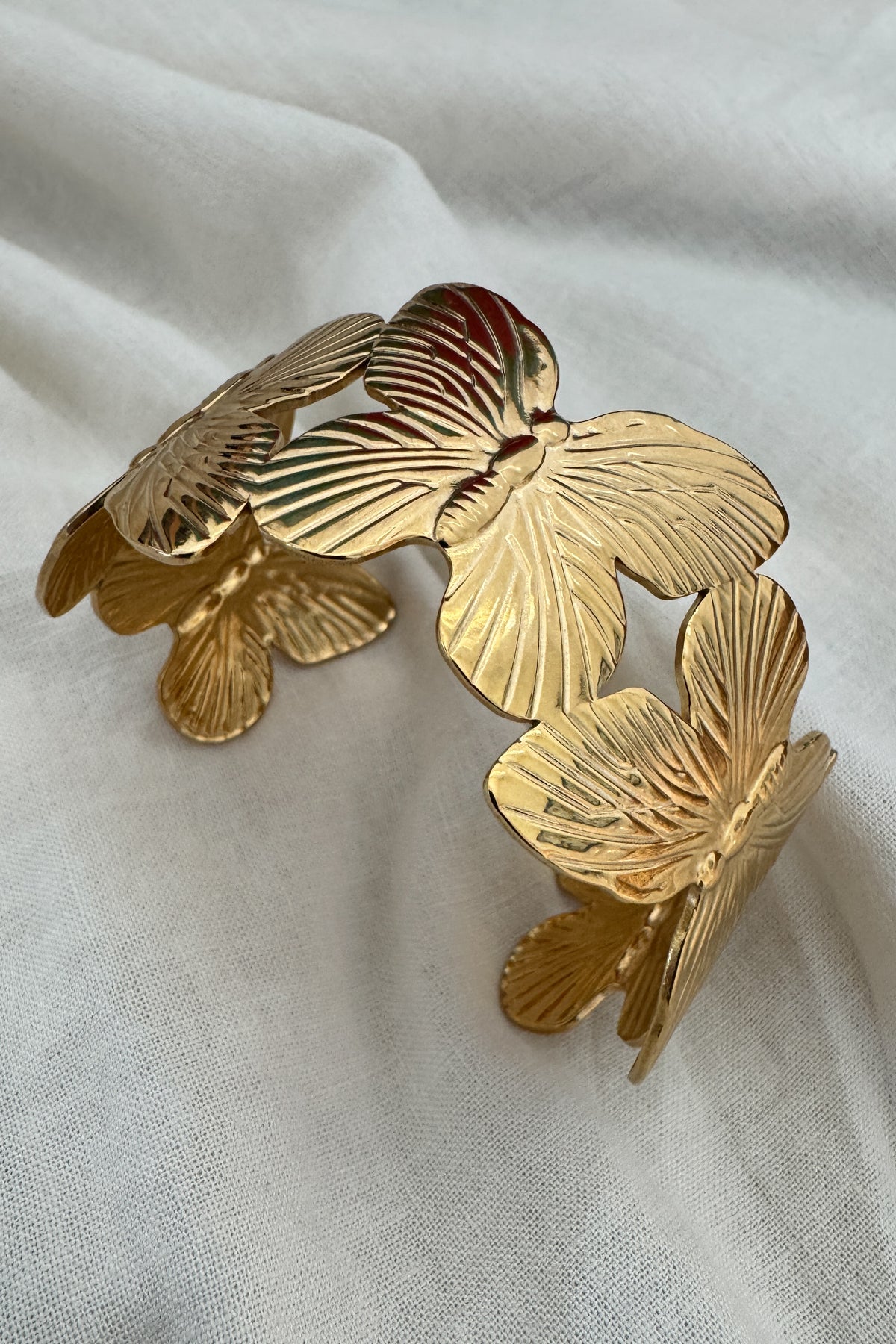 Let your style take flight with this stunning butterfly cuff. Bold yet delicate, this statement piece wraps your wrist in etched golden wings that shimmer with every move. It’s the perfect finishing touch for breezy dresses or classic denim days.