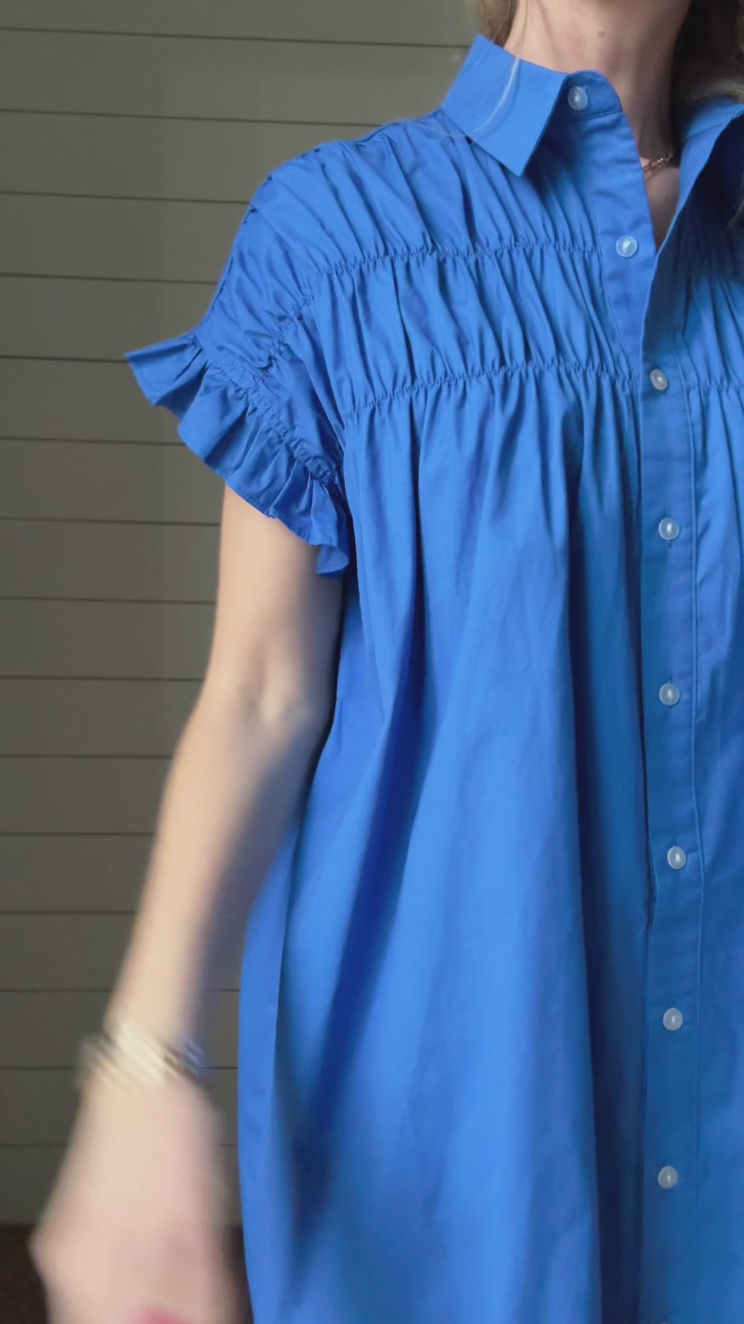 This is the dress that'll take you through Spring & Summer. 100% poplin cotton, feminine shoulder detailing & baby ruffles on the sleeves in the most flattering shade of blue. No pockets or lining on this dress, it is made to keep things lightweight.