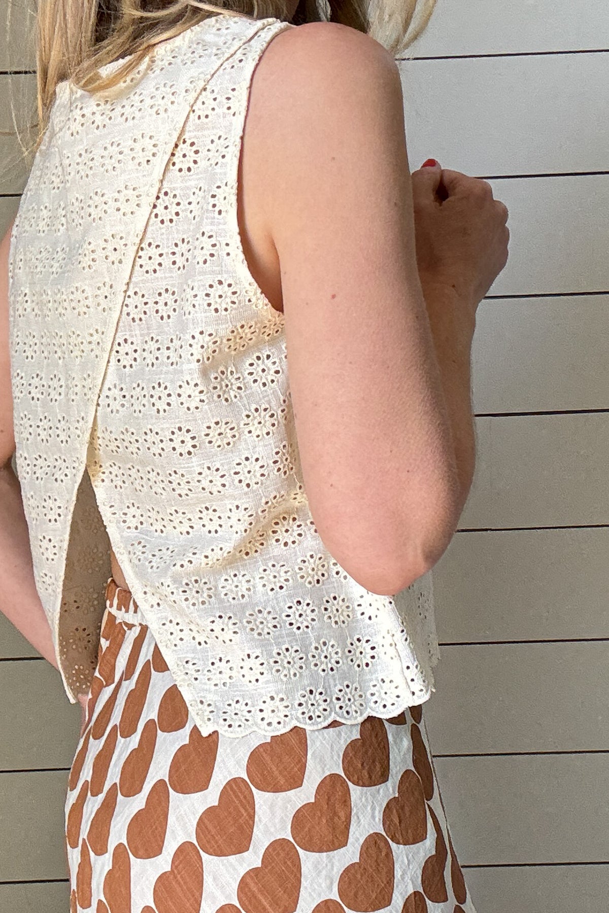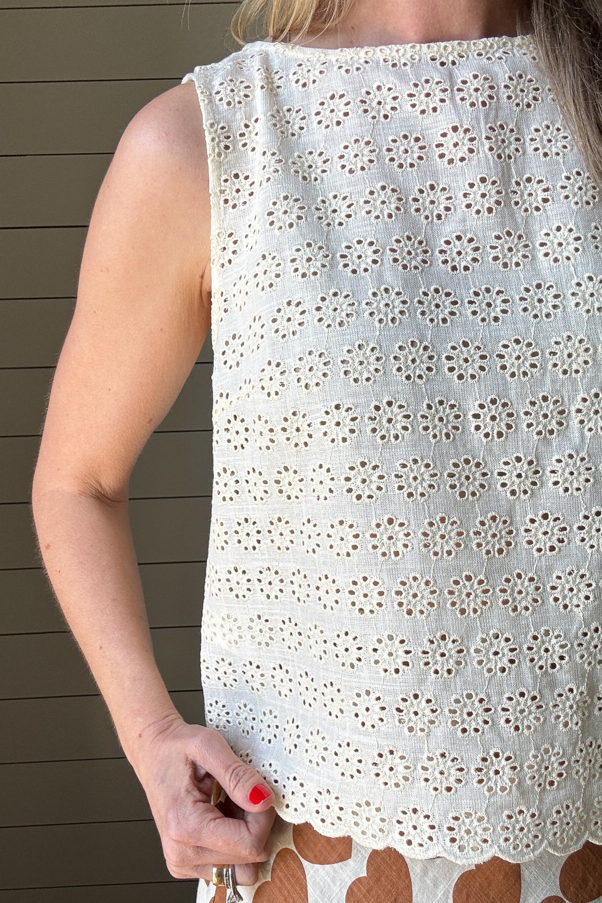 Light, airy, and effortlessly chic! This cream eyelet blouse from Traffic People is crafted from a luxe blend of 50% linen and 50% cotton, making it breathable and perfect for any season. The delicate eyelet detailing adds a touch of romance, while its relaxed fit keeps it easy to wear. Pair it with denim or flowy skirts for a timeless, feminine look. Eyelets in the front & (strategically placed & bra friendly) open back detailing make this blouse a warm weather must have.